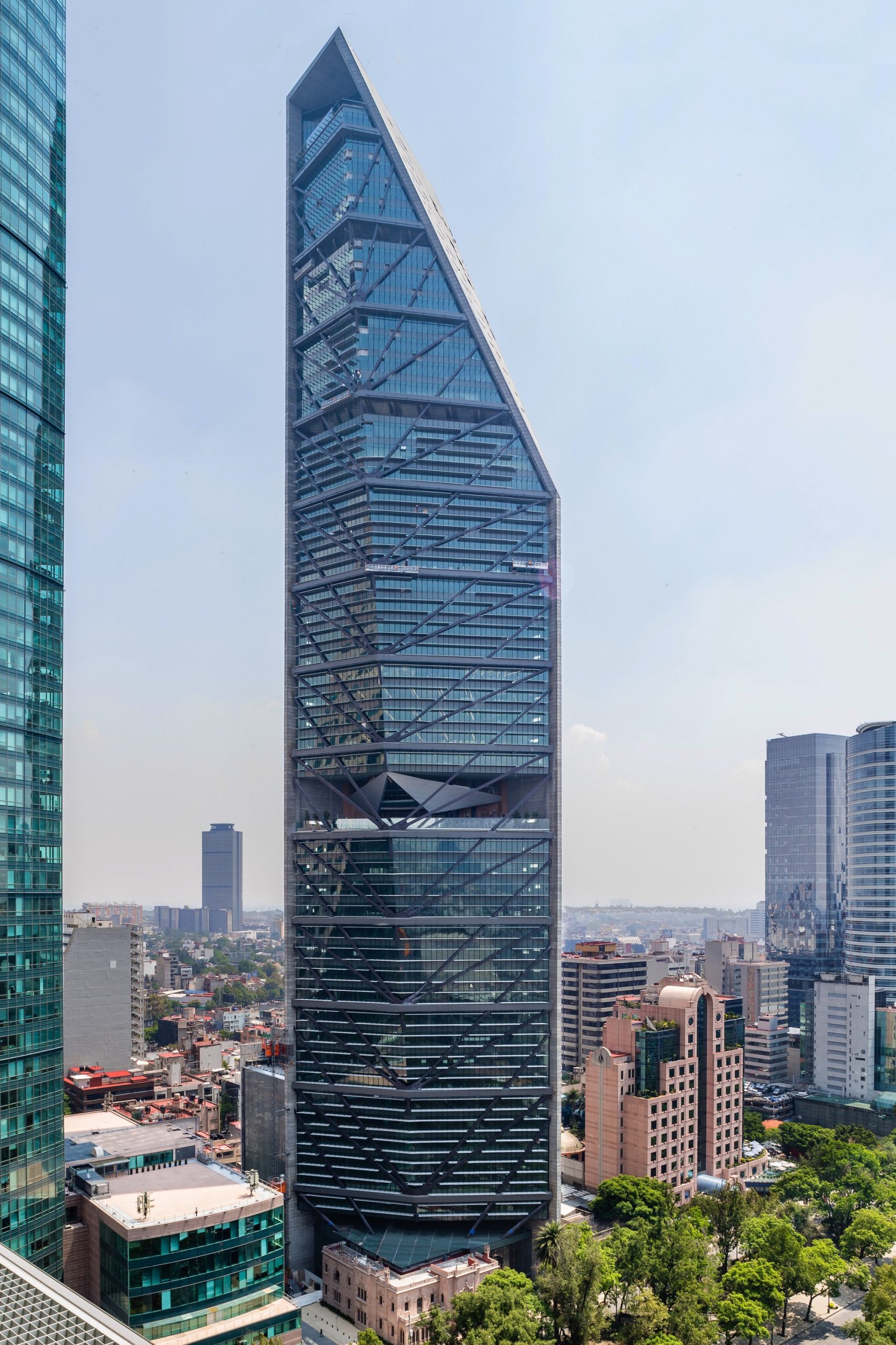 La Torre Reforma es uno de los rascacielos más importantes en el panorama arquitectónico de la Ciudad de México. Diseñada por el arquitecto L. Benjamin Romano, esta torre de oficinas de 807 metros de altura es una muestra sobresaliente de la arquitectura de vanguardia mexicana. El diseño incorpora materiales sostenibles como el vidrio y el acero, y su forma asimétrica busca no solo maximizar la eficiencia energética, sino también brindar una identidad visual única al skyline de la ciudad. Su estructura de 15 pisos con una base de concreto y una serie de innovaciones tecnológicas para la eficiencia energética hacen de este edificio un referente de la arquitectura moderna en la ciudad.