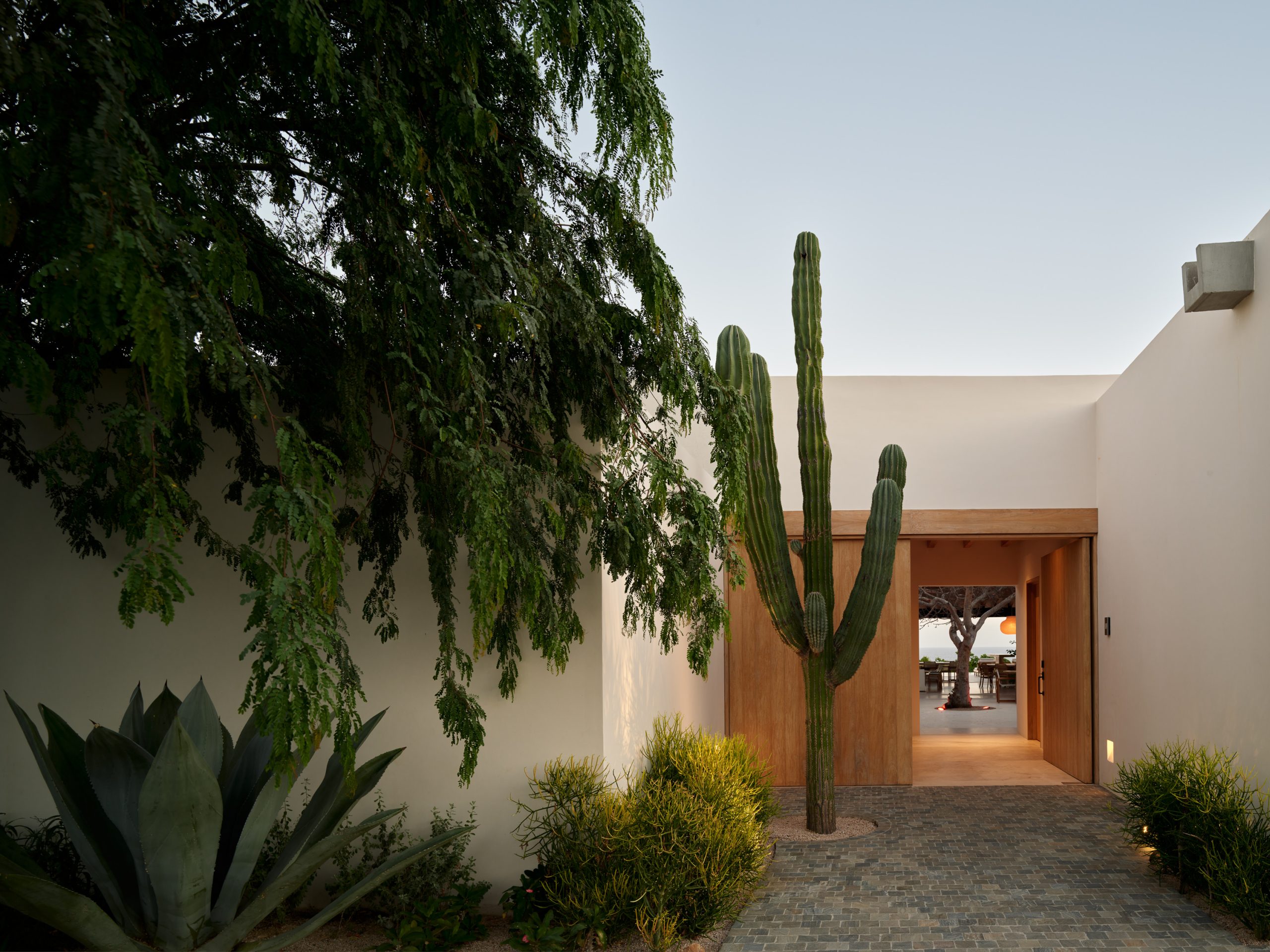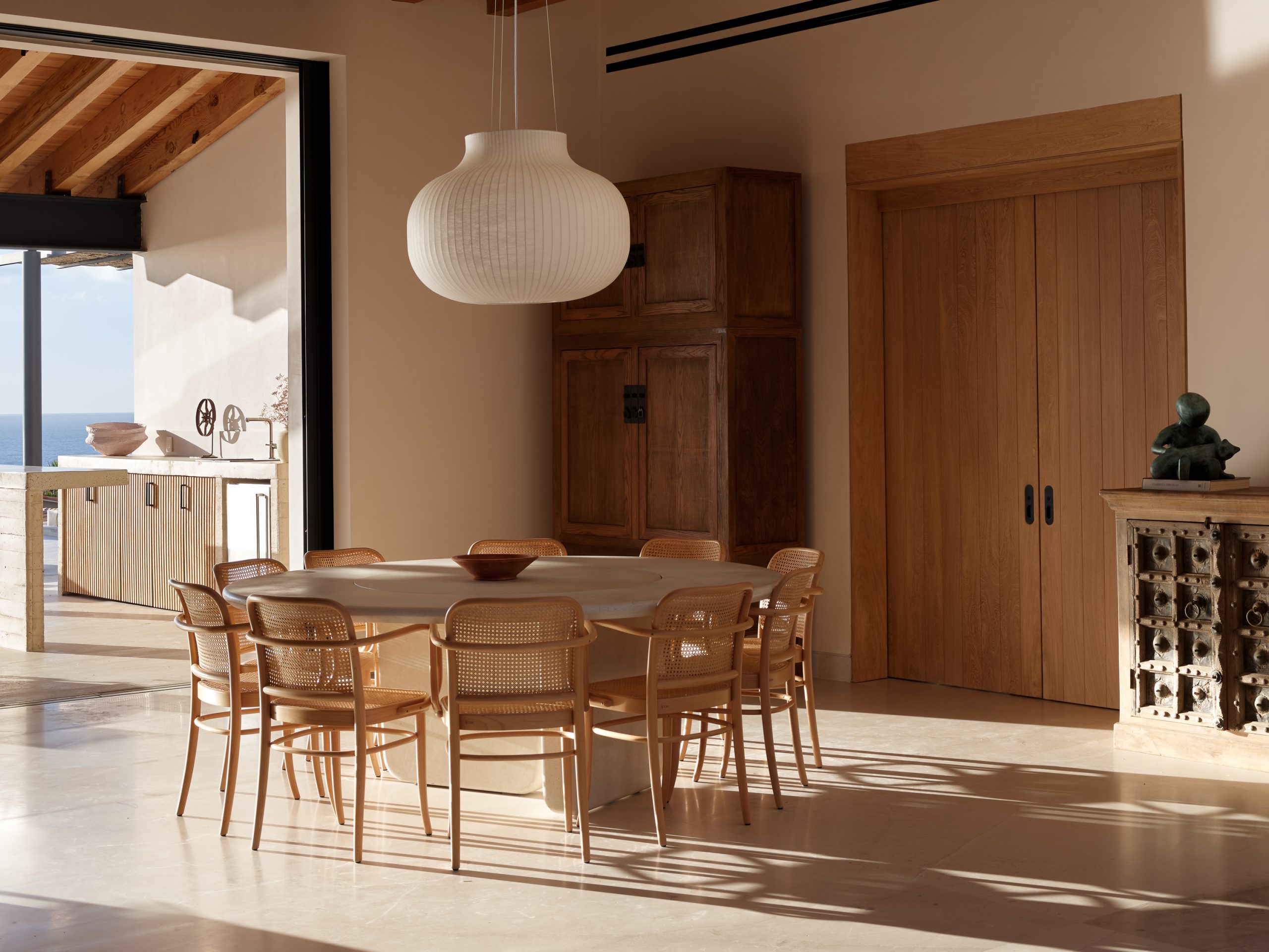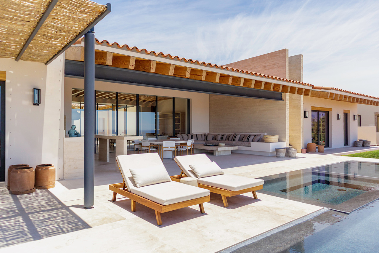 Su diseño bioclimático responde con inteligencia al clima árido: una composición de volúmenes escalonados, orientados para evitar la radiación solar directa, optimiza la ventilación cruzada, reduciendo la temperatura interior con estrategias de diseño pasivo, como lo es también la elección de piedra, madera y concreto texturizado: no se trata solo de una decisión estética, sino de procurar un control térmico que mantenga la casa confortable con un consumo energético mínimo, apoyado por un sistema de paneles solares y captación de agua de lluvia.