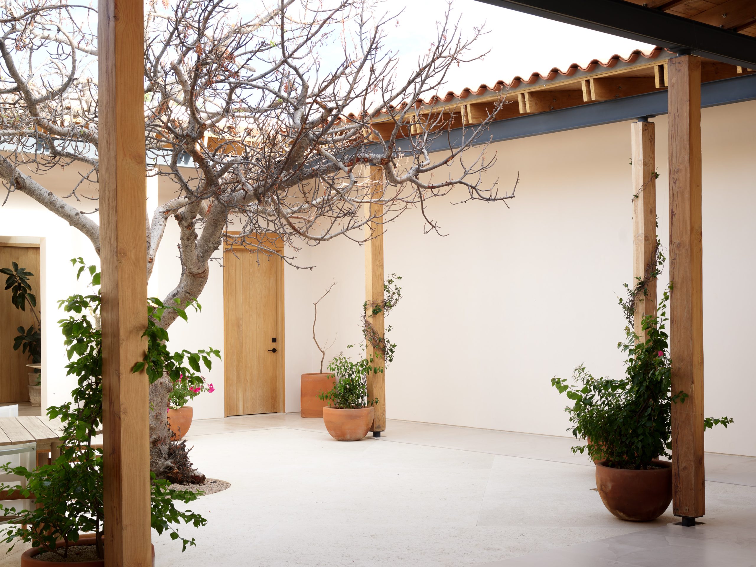 El corazón del proyecto es un patio central, un espacio de transición que actúa como pulmón y núcleo emocional. Aquí, un ciruelo de montaña ancla la vida cotidiana, mientras que el aire y la luz orquestan un ritmo cambiante a lo largo del día.