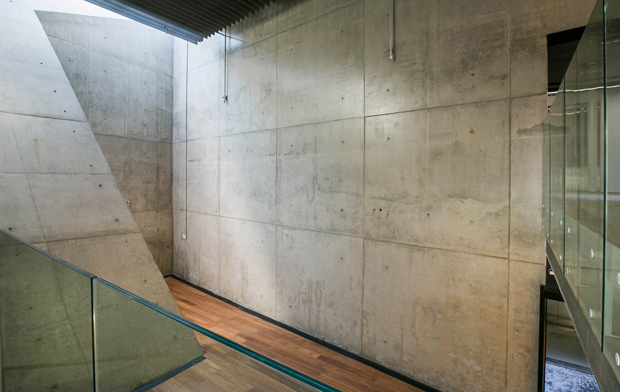 Por otra parte, la fachada de hormigón con pliegues crea sombras que se convierten en luz cuando los visitantes acceden al edificio. Cuenta con una entrada sin barreras físicas que da al espacio un carácter acogedor e invita a los asistentes a ingresar en el.