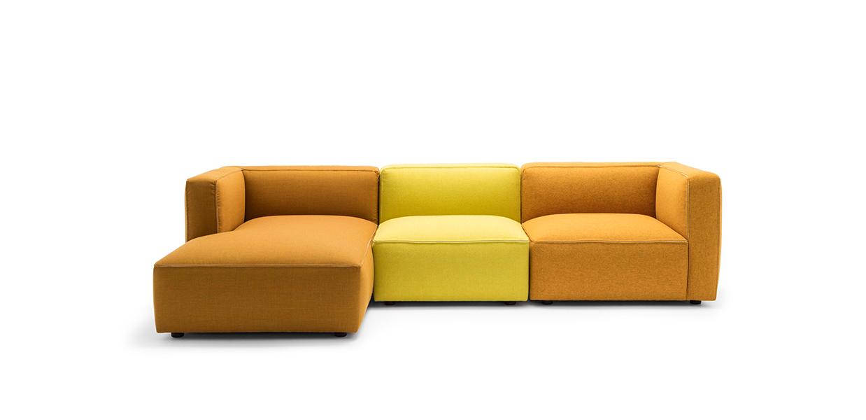 Así como los cubos con los que jugábamos de niños, con Dado de Andreu World también las posibilidades de combinación resultan infinitas: hay esquinas, módulos centrales y chaise longue en dos medidas, butacas de una plaza en milímetros estándar (950 por 800) y reposapiés en cuatro variaciones, en varios, intensos y bellos colores. Su característica estrella resulta su fina tapicería: una tela principal adornada con delgados ribetes y tiras en el tono protagonista o haciendo contraste, que apenas delinea y define la forma de los asientos, enmarcando así el elegante trabajo en tapiz.