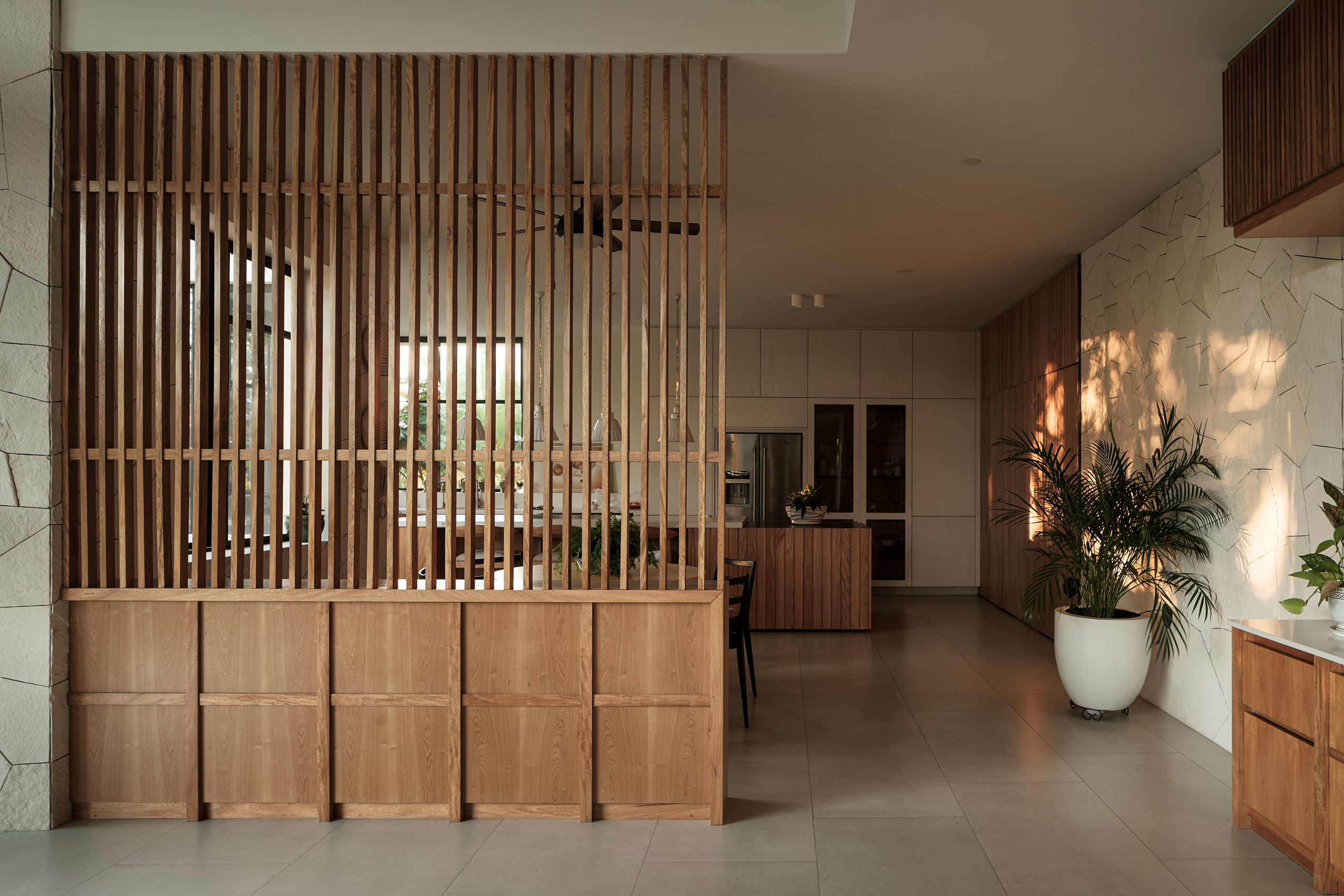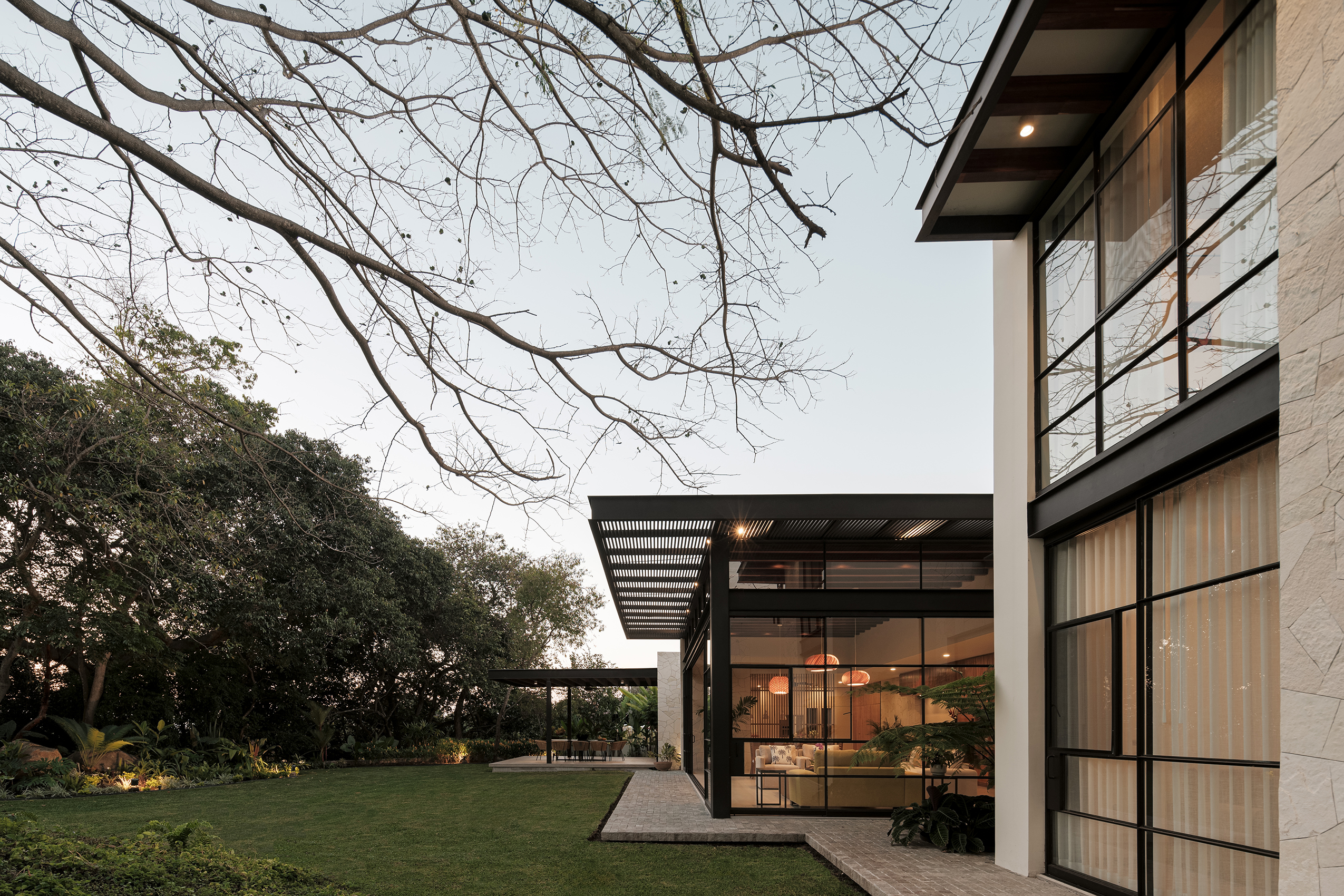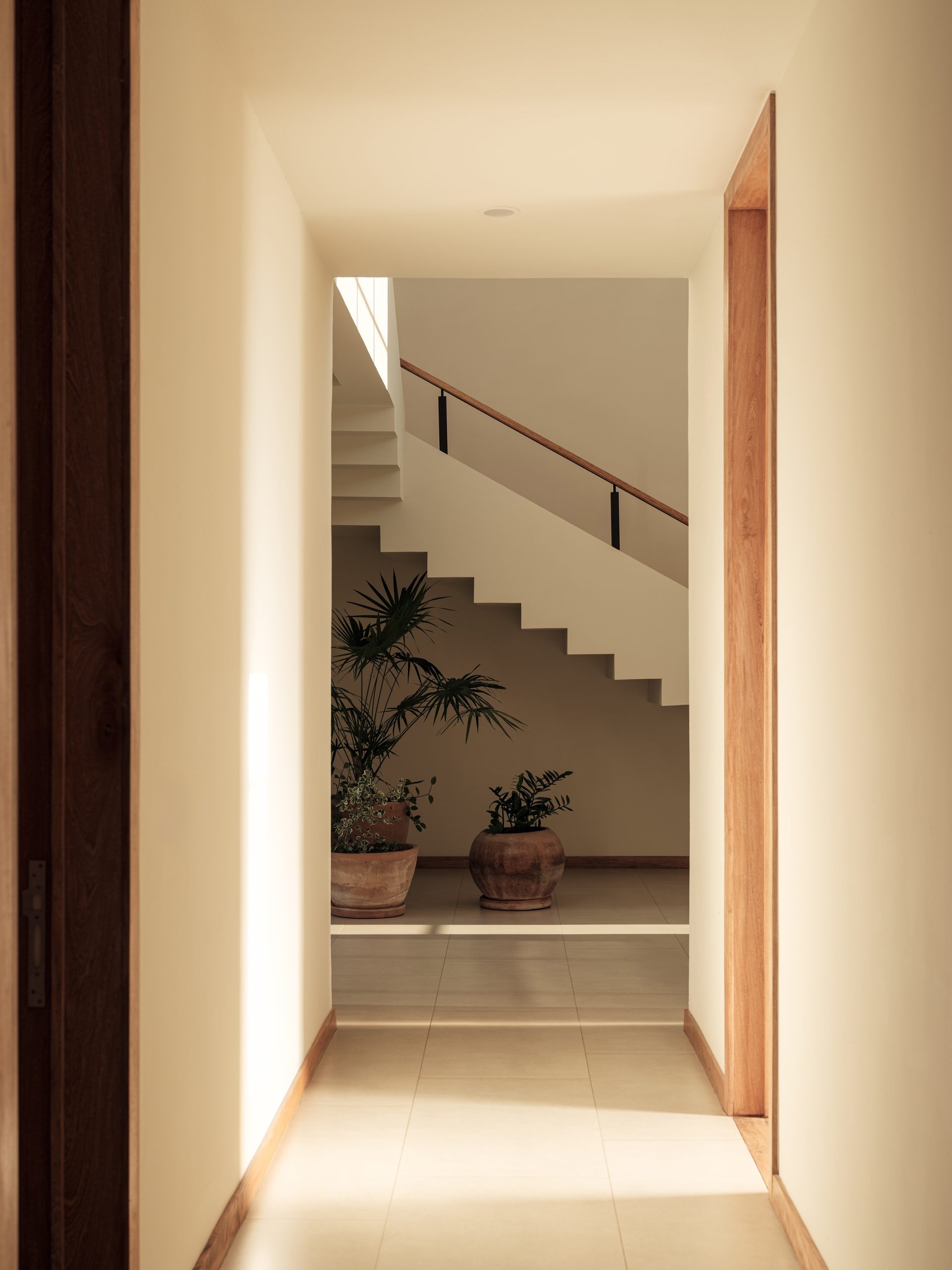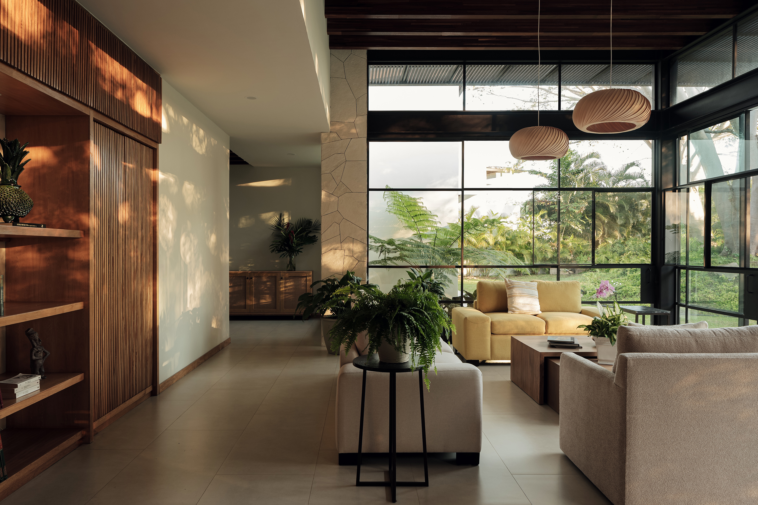 La luz natural se convierte en materia prima, en eje de la experiencia espacial. Cada abertura diseñada para captar un instante específico del día, genera transiciones emocionales que son capaces de acompañar la vida de quienes habitan Casa Calantha. Más allá de iluminar en un sentido funcional, el propósito es evocar momentos: el destello matinal sobre los muros, la penumbra al caer la tarde, la intimidad de la noche filtrada por la parota.