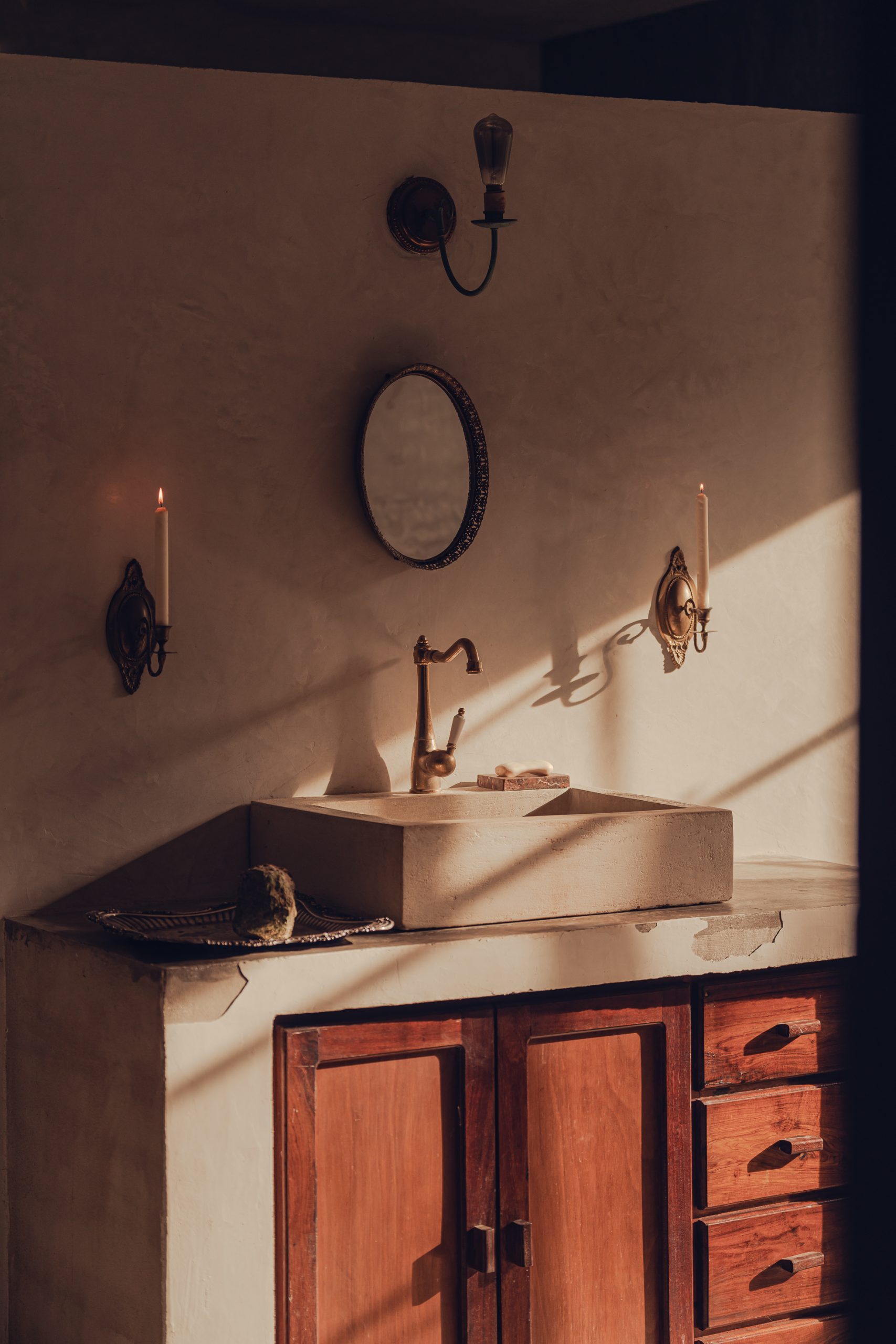 La mayoría de las piezas de mobiliario que aparecen en las imágenes fueron diseñadas y fabricadas por nosotros, mientras que otras proceden de antiguas granjas de Yucatán. También incorporamos candelabros y porta velas vintage de Brooklyn y París. Además, todas las pinturas y esculturas del espacio fueron creadas por nosotros. Algunas sillas, taburetes y los dos sofás se compraron en nuestra tienda Terreo Decor de Tulum.