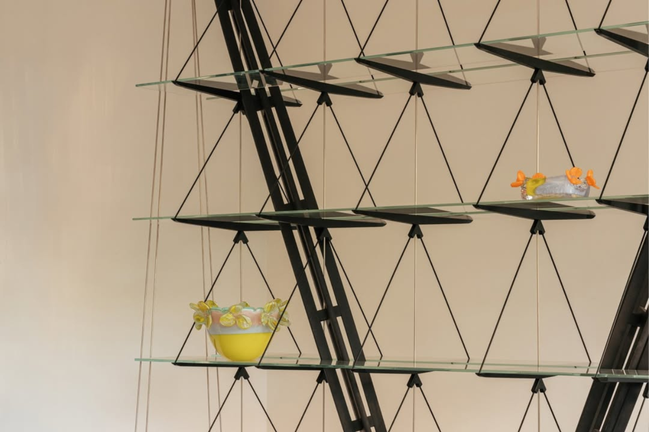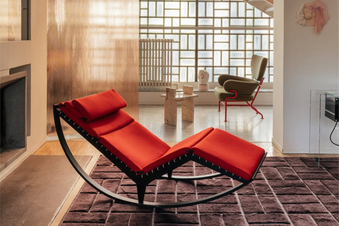 Dentro de Villa Pestarini, la intervención curada por Patricia Urquiola para Cassina y Haworth se organiza a partir de elementos que recuperan el lenguaje de Albini, integrando piezas históricas con nuevas disposiciones que sugieren una domesticidad extendida. La luz, filtrada por los bloques de vidrio, define la atmósfera con una presencia tenue.