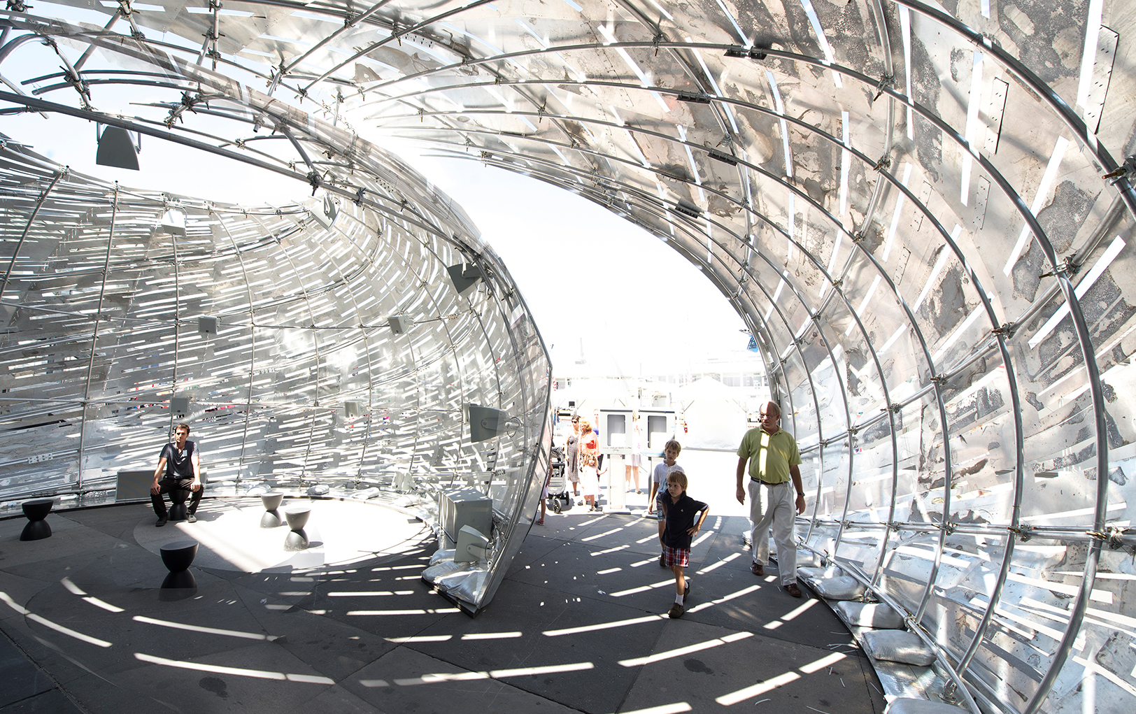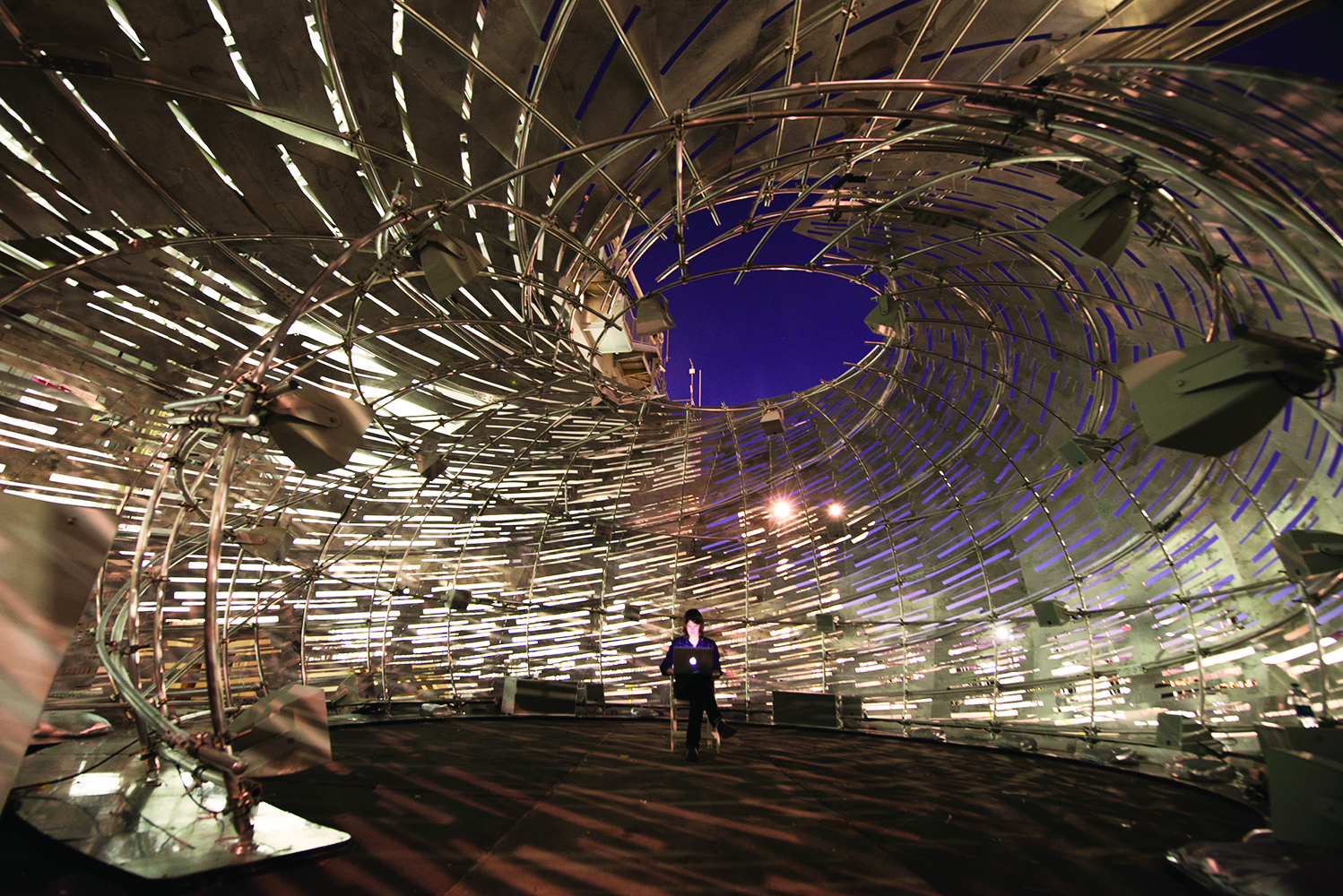 Basados en sus memorias infantiles, construyeron una estructura en forma de nautilus con más de 1,000 metros cuadrados de paneles de aluminio cortados en patrones orbitales que se ensamblan sobre un sistema tubular. Todo esto define un espacio interior de 30 pies de diámetro que confluye en un oculus central.