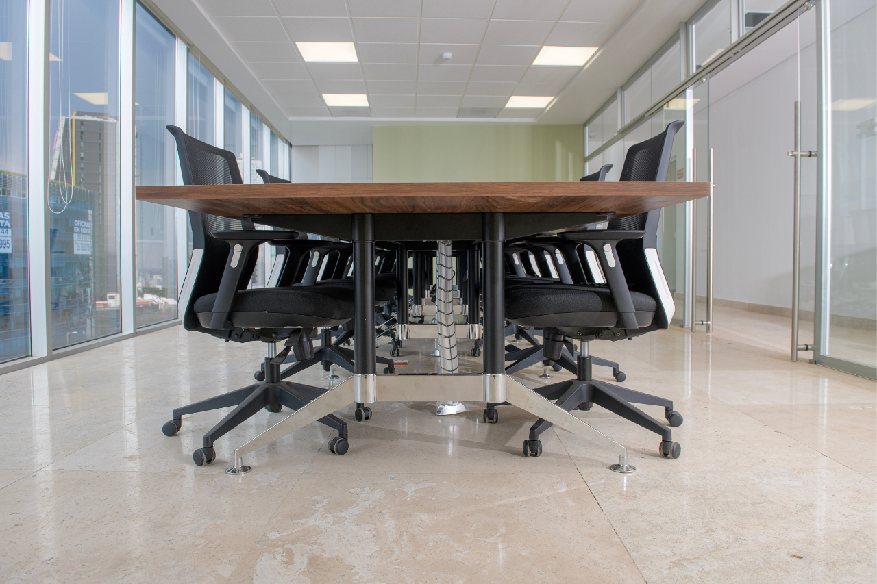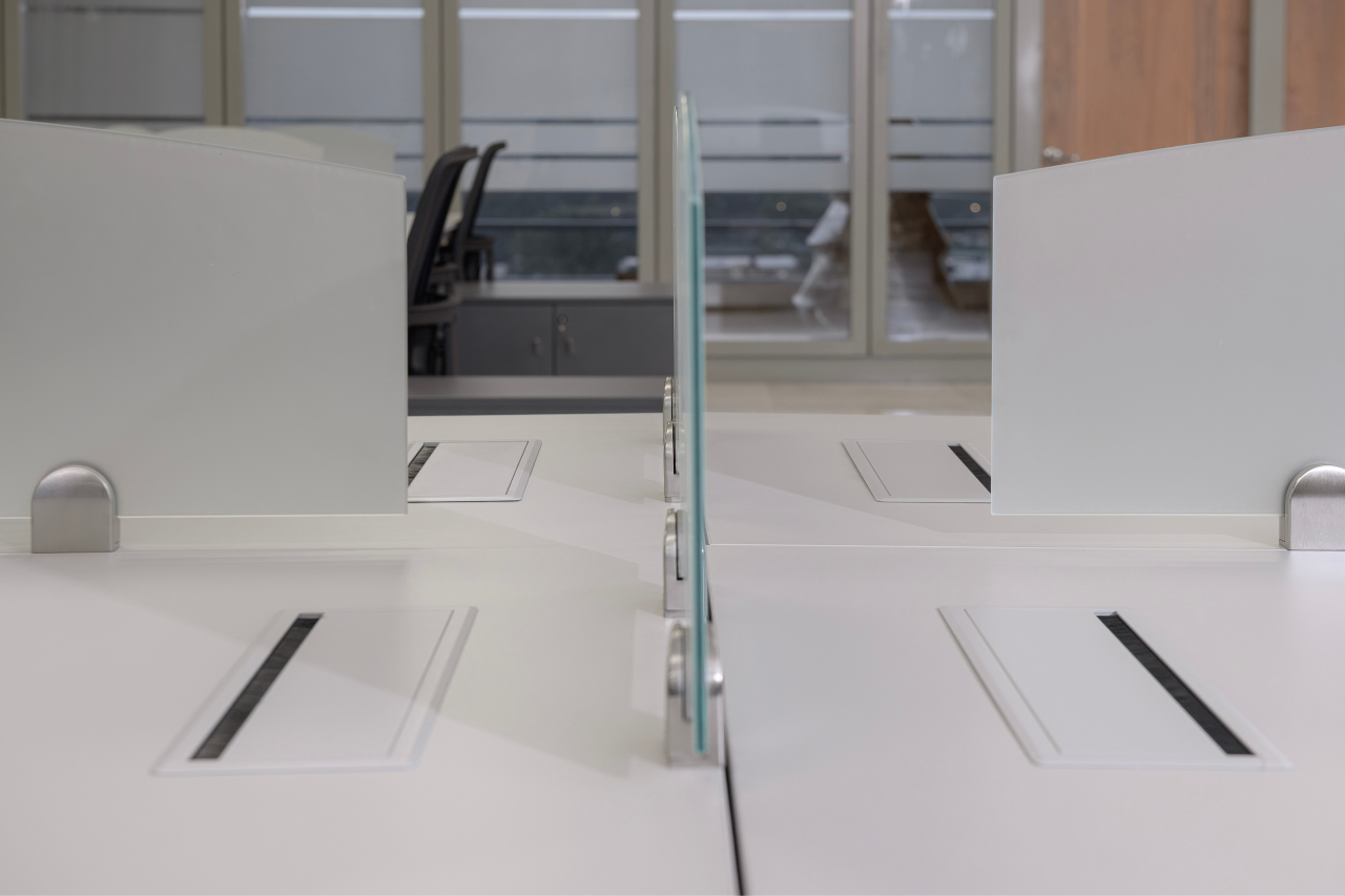 Los multiports y grommets, por ejemplo, se incorporan en las superficies de trabajo de forma casi invisible, manteniendo cables y conexiones organizadas. Ese detalle, aparentemente menor, cambia por completo la experiencia del espacio.