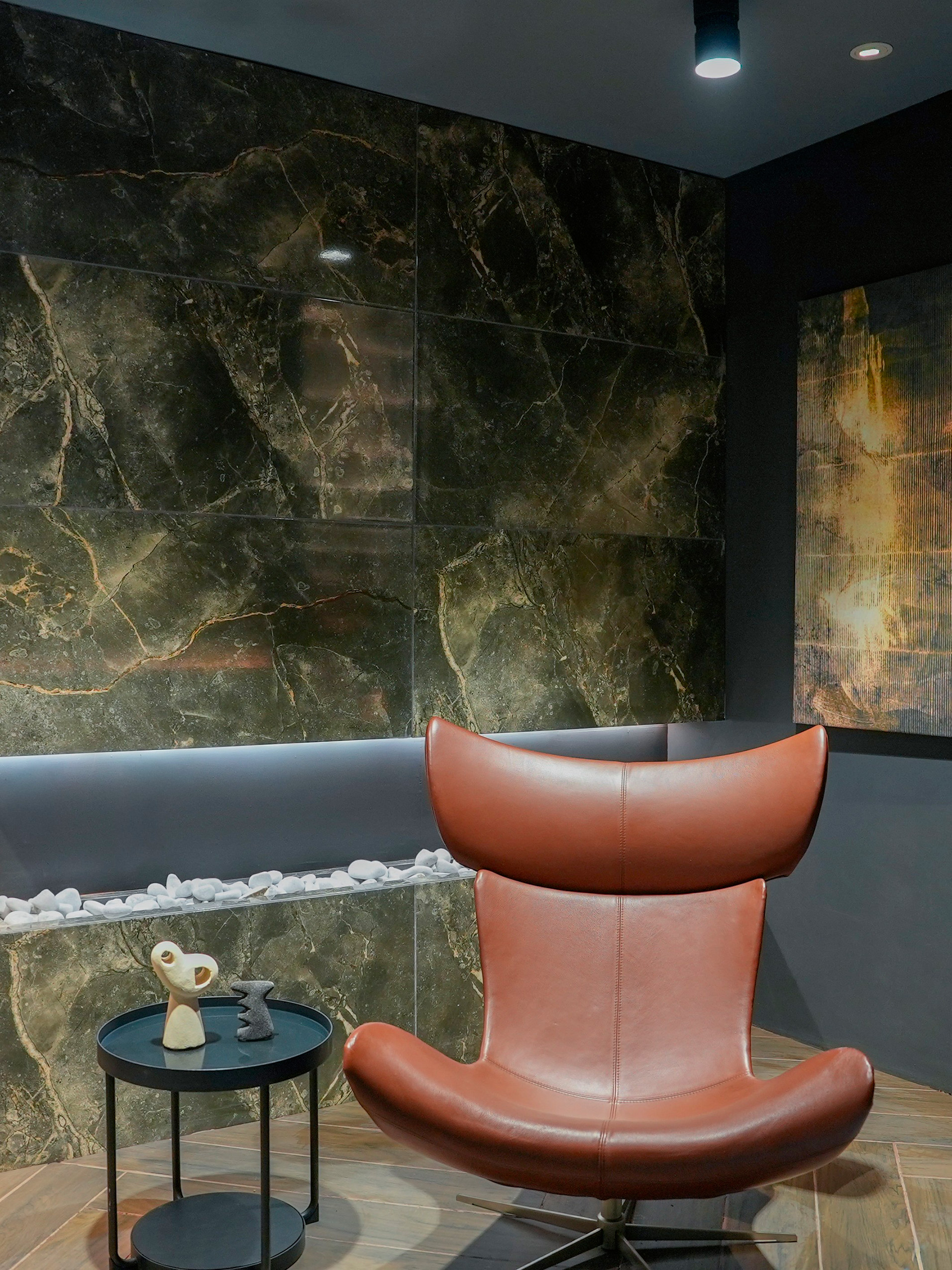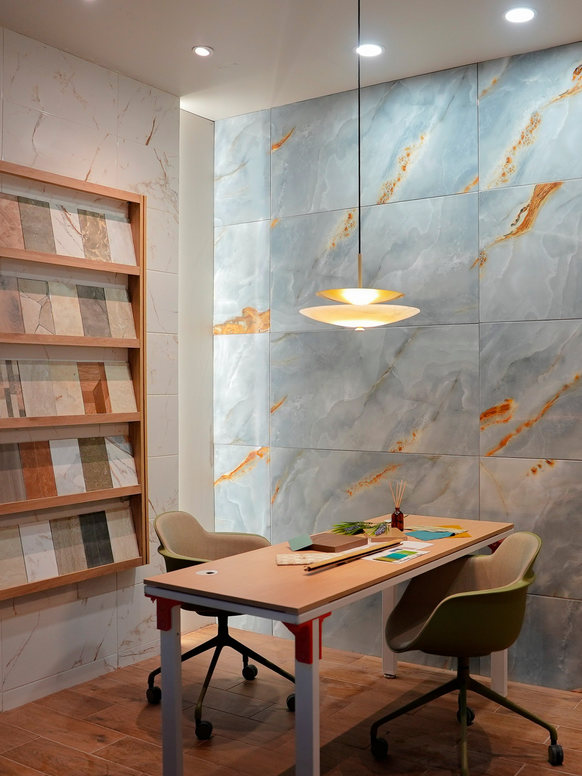 Los mármoles blancos —del carrara clásico al crema marfil— ofrecen una presencia limpia y versátil. Las piedras, reunidas en familias como Bramasole y Cenere, facilitan la continuidad visual en proyectos amplios. Las piezas de madera recuperan la estética del parquet y el tablón, ahora con la posibilidad de instalarse en zonas húmedas sin cuidados especiales. Los muros brillantes en verde jade y azul cobalto introducen acentos llenos de carácter que pueden transformar una habitación sin esfuerzo.