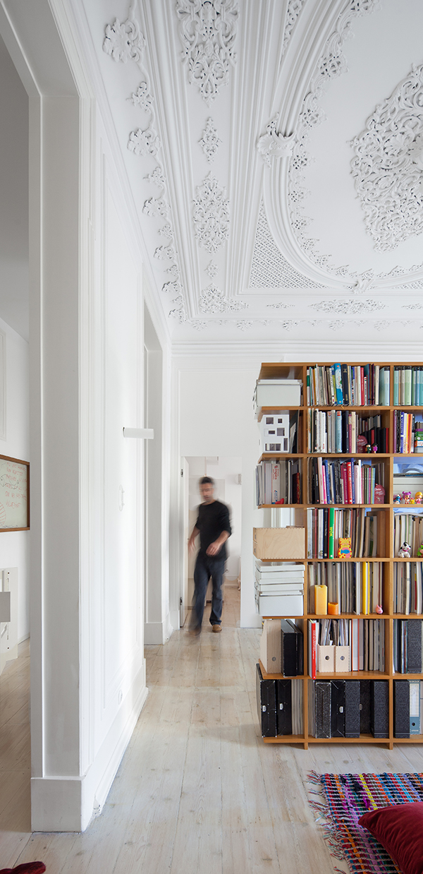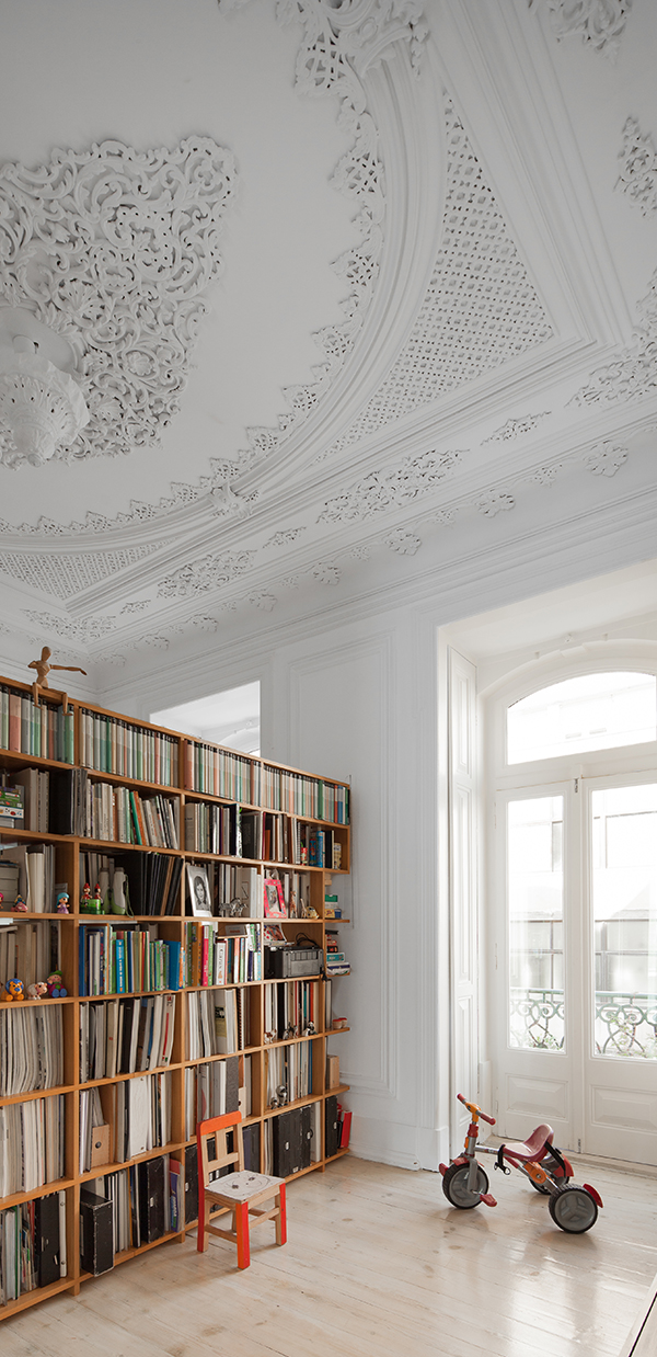 “Intentamos implementar una solución silenciosa. Un diálogo desde la yuxtaposición de lenguajes, materiales y sistemas de construcción. En esta dialéctica funcional, reconfiguramos solamente los sistemas hidráulicos, eléctricos y de servicios”, explica Carlos Veloso de Atelier Veloso Arquitectos, los restauradores de este quinto piso de un edificio construido en 1893, y que ahora, con esta restauración, muestra el esplendor del artesanal trabajo en el techo en blanco pero con agregados de colores intensos en su mobiliario. La lámpara de la sala fue diseñada por el mismo Carlos Veloso para ese espacio en particular, y se agregó lo mejor en tecnología de seguridad a las puertas originales del edificio. Lo único que se creó desde cero fue el baño.