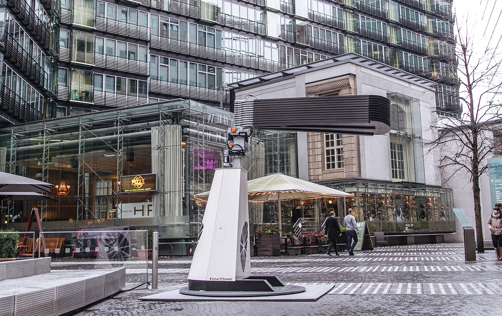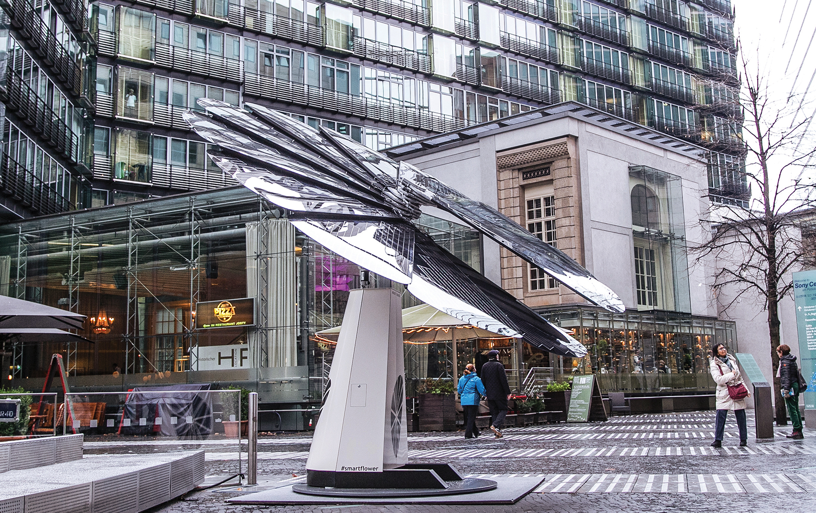 Al amanecer Smartflower POP se despliega automáticamente y, con su elegante movimiento en forma de abanico, orienta sus módulos solares en dos ejes durante todo el día.