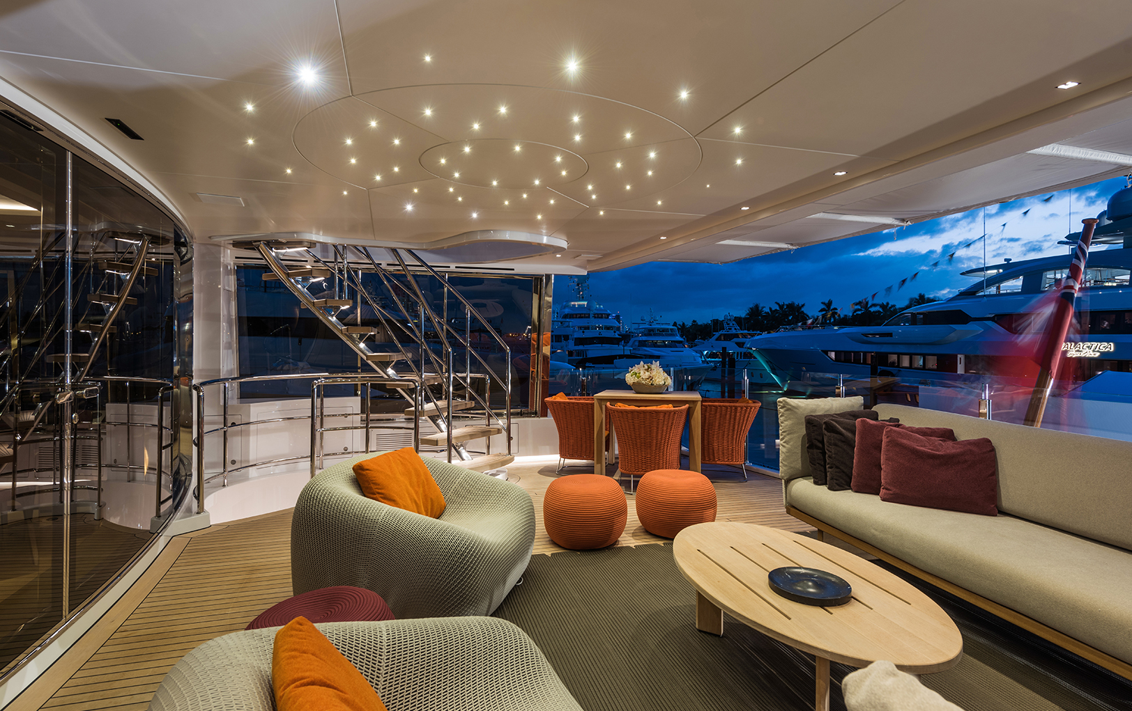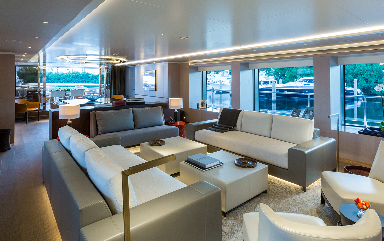 El arquitecto Ezequiel Farca desarrolló un concepto de diseño interior que fuera más allá de lo meramente estético para definir cada espacio por su propósito específico, tomando en cuenta el carácter familiar y social de sus habitantes habituales: “En este caso pudimos meternos a la distribución completa del barco y solucionar las necesidades del cliente; por ejemplo, hay un elevador que sube hasta el sundeck que está completamente al exterior, el cual generó cambiar escaleras y circulaciones”.